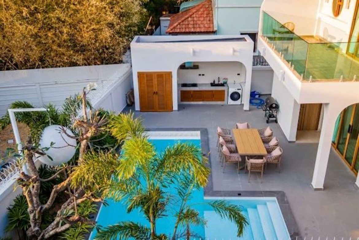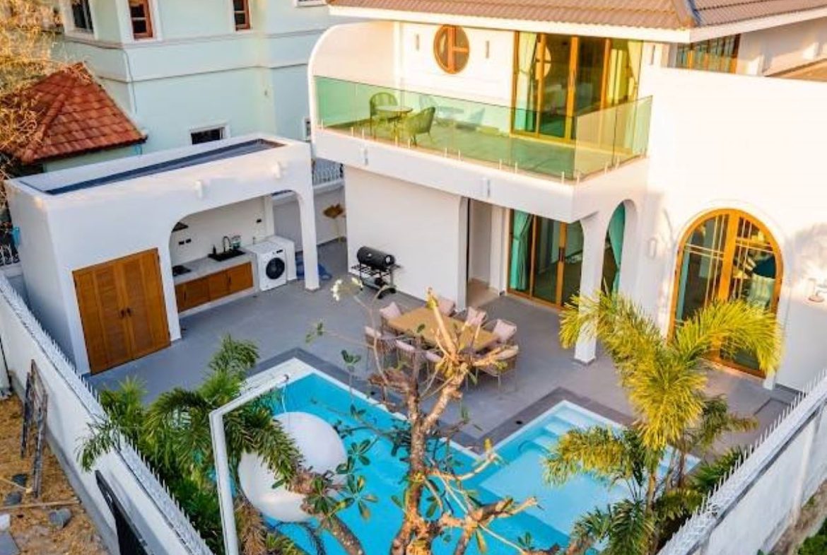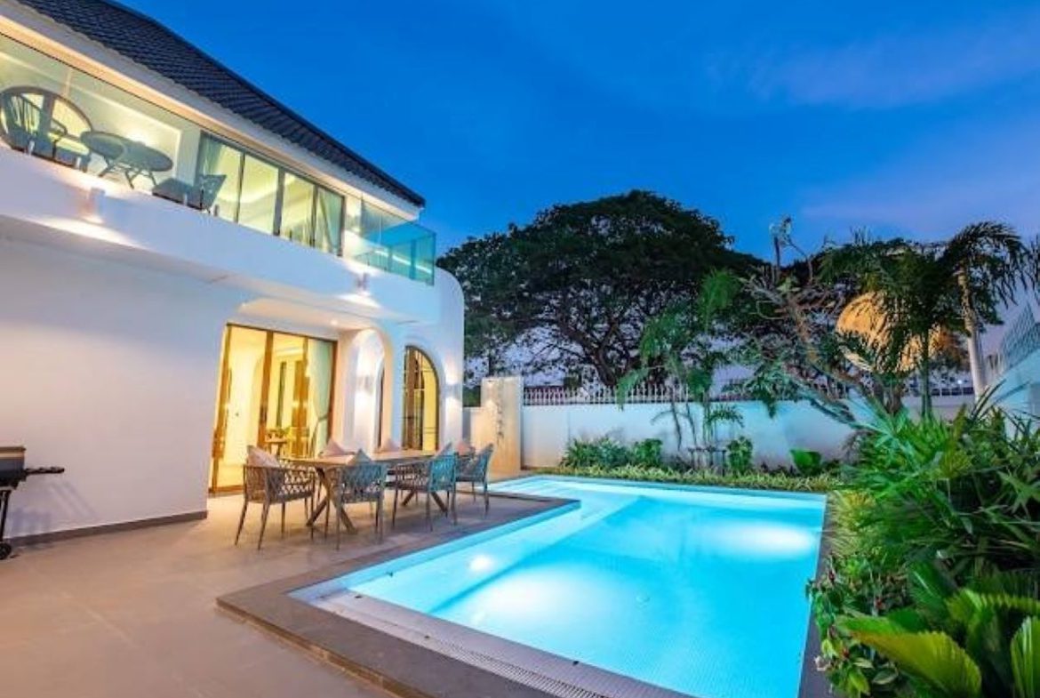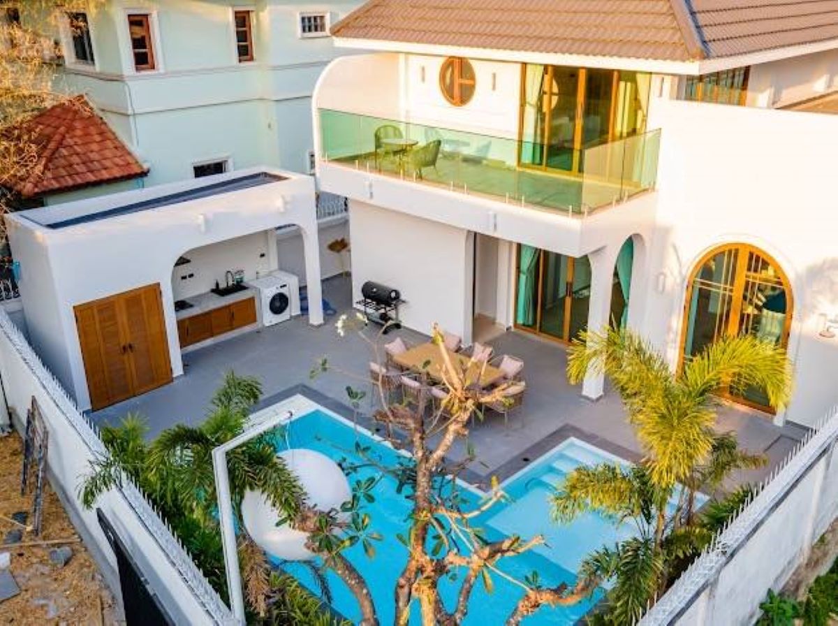 This Pattaya 2 storey Private Pool Villa for Rent in Jomtien, The property is situated on 352 sq/m of land and has a living area of 330 sq/m including 4 Bedrooms and 5 Bathrooms. This house is currently available on the market for Rent at ฿ 160,000 THB per month. This house is being advertised Fully Furnished.
