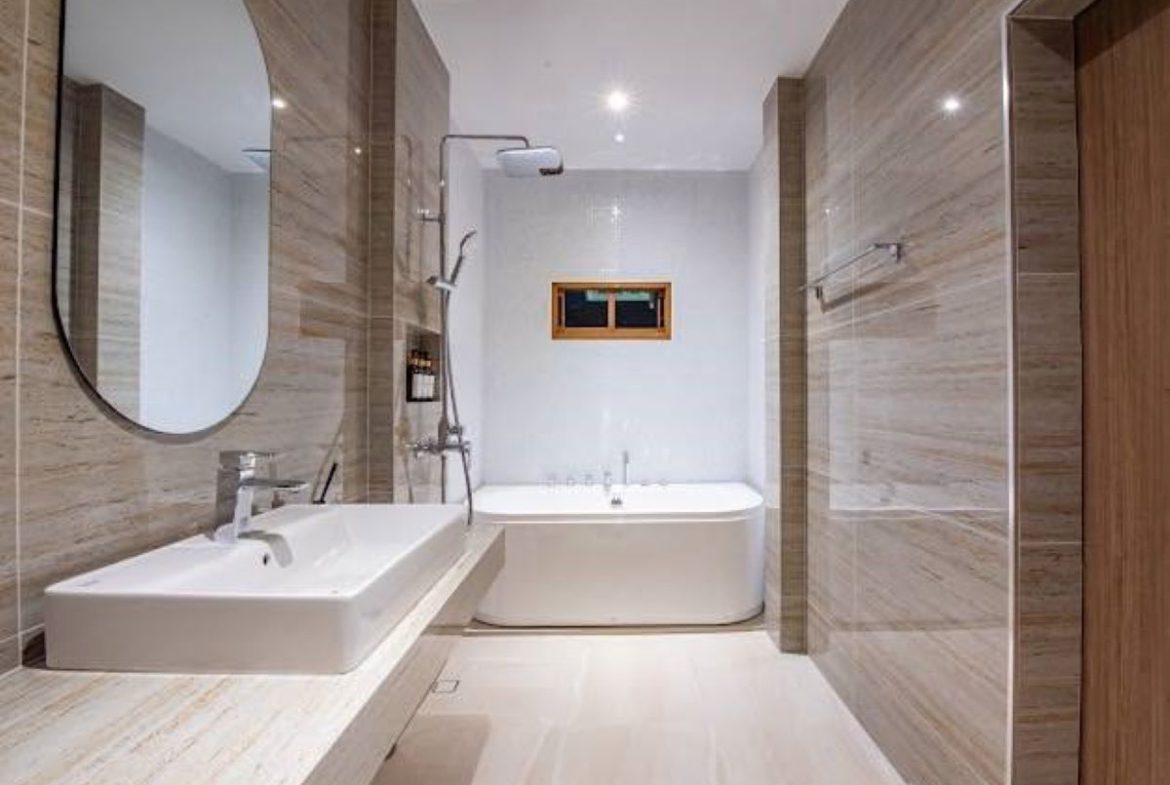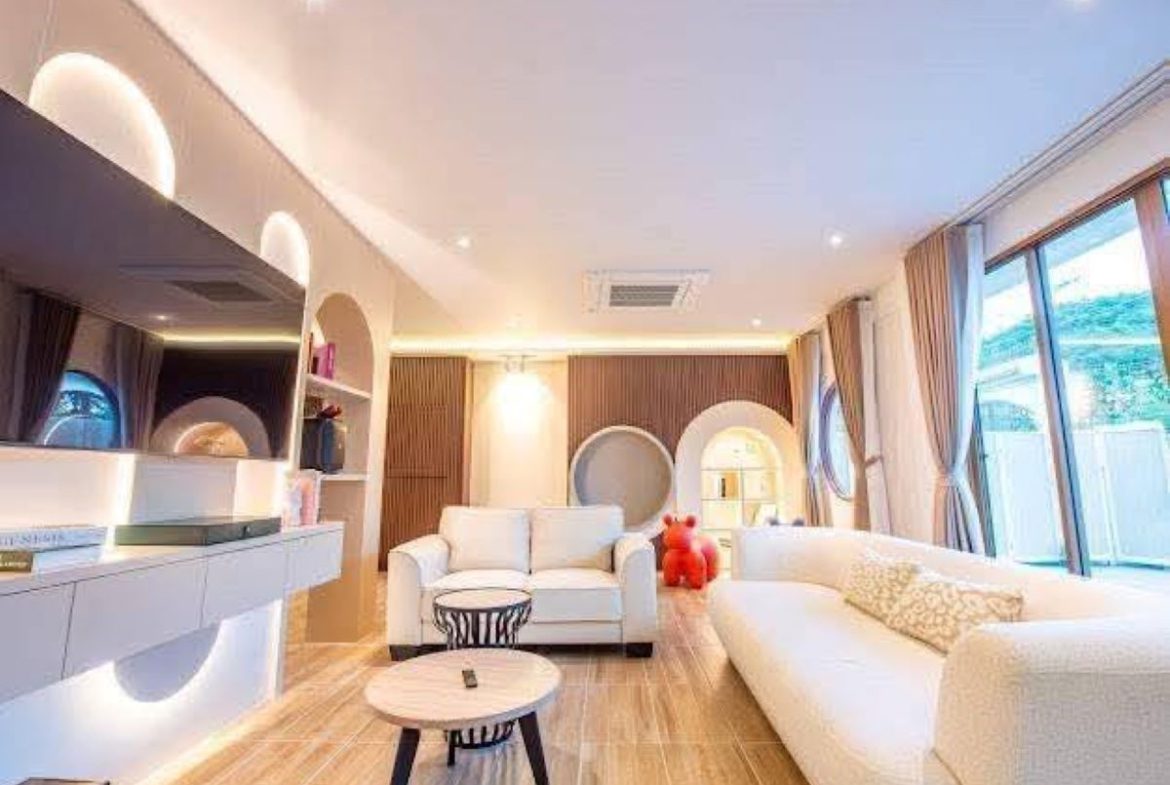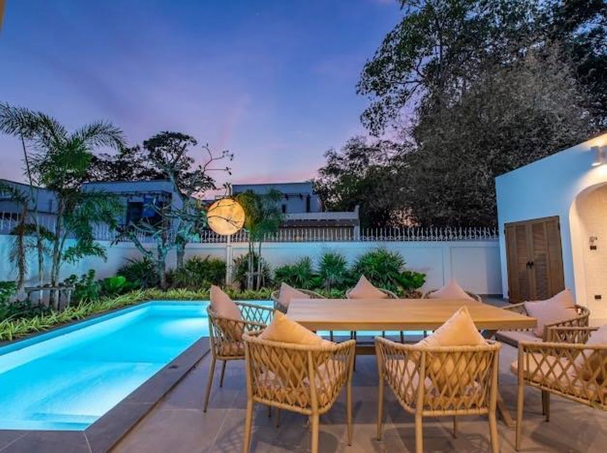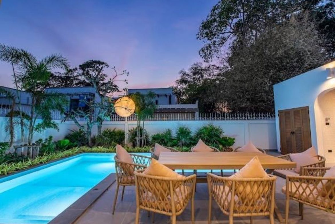This Pattaya 2 storey Private Pool Villa for Rent in Jomtien, The property is situated on 352 sq/m of land and has a living area of 330 sq/m including 4 Bedrooms and 5 Bathrooms. This house is currently available on the market for Rent at ฿ 160,000 THB per month. This house is being advertised Fully Furnished.