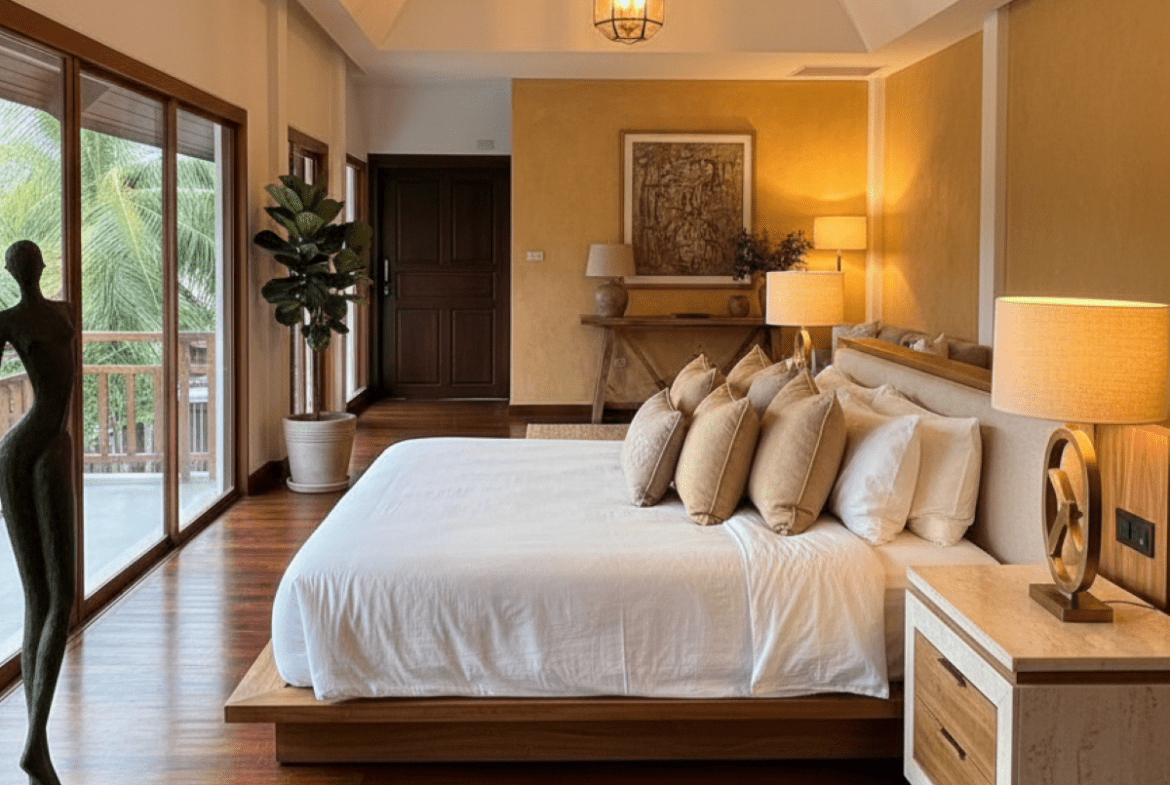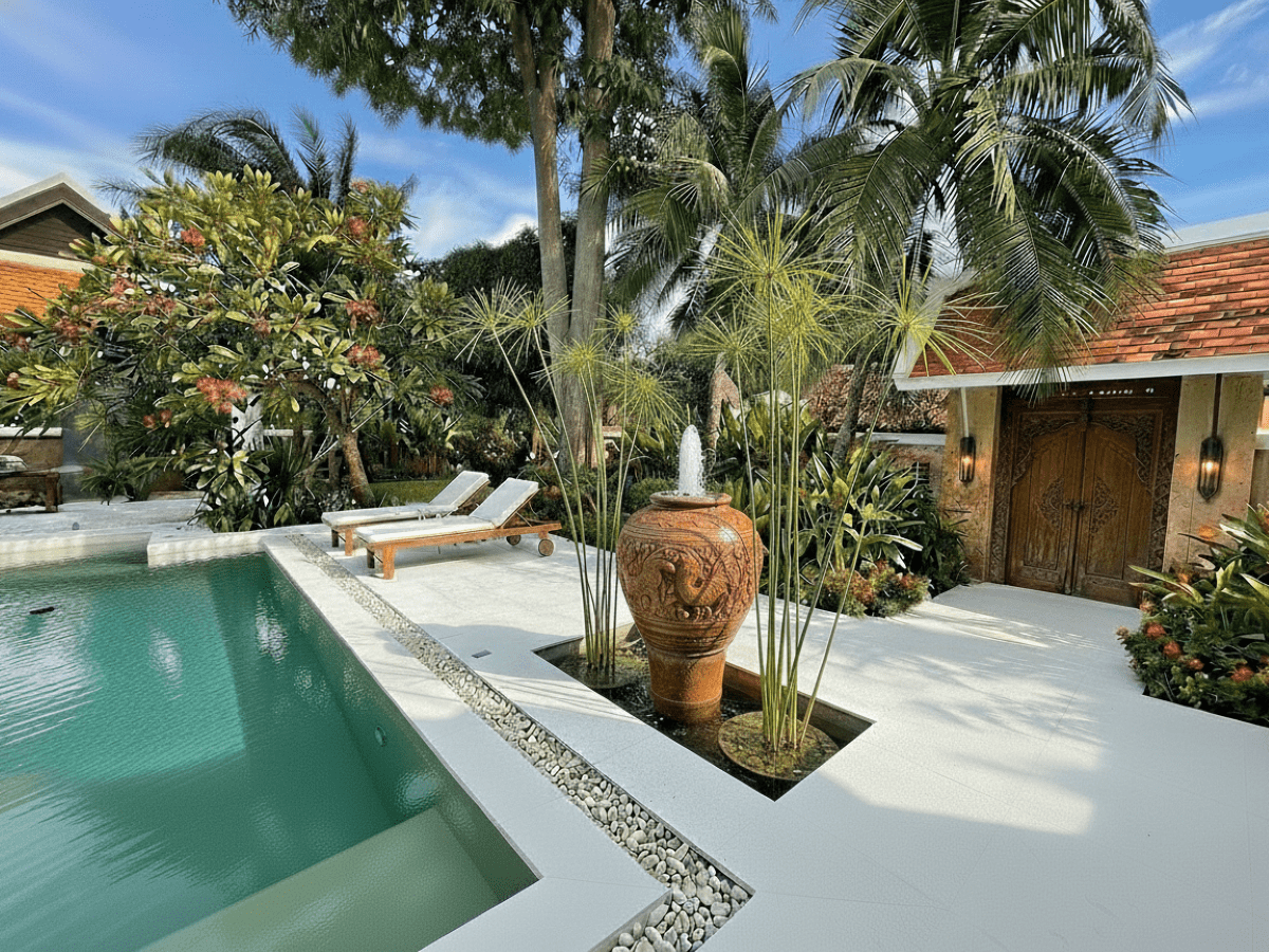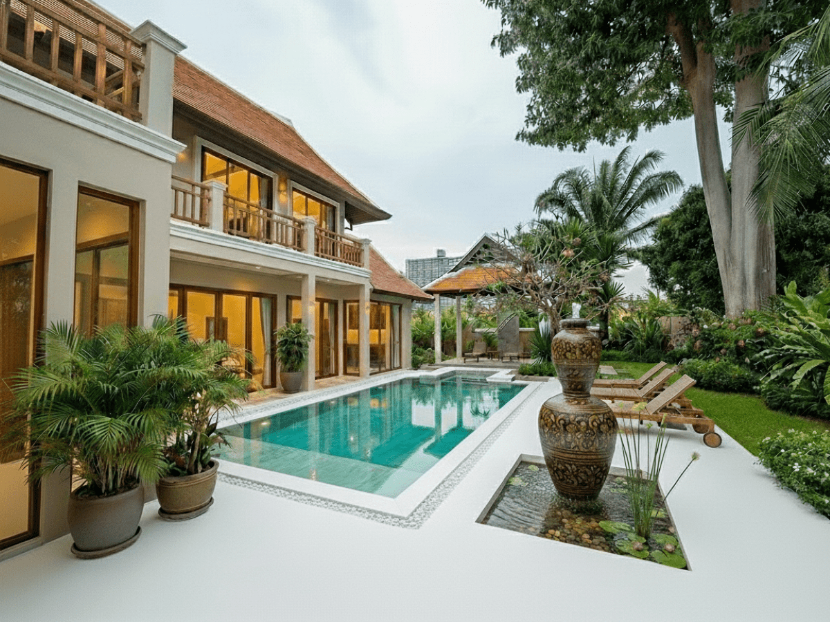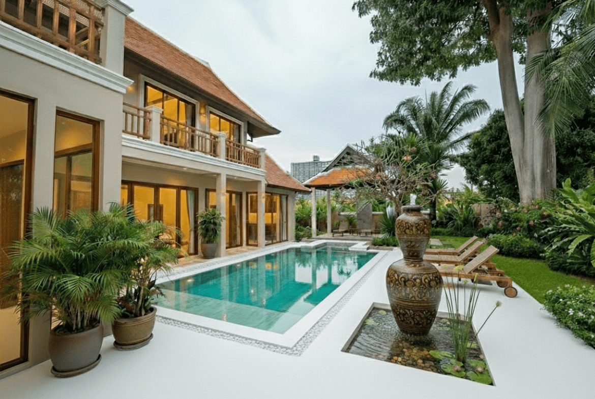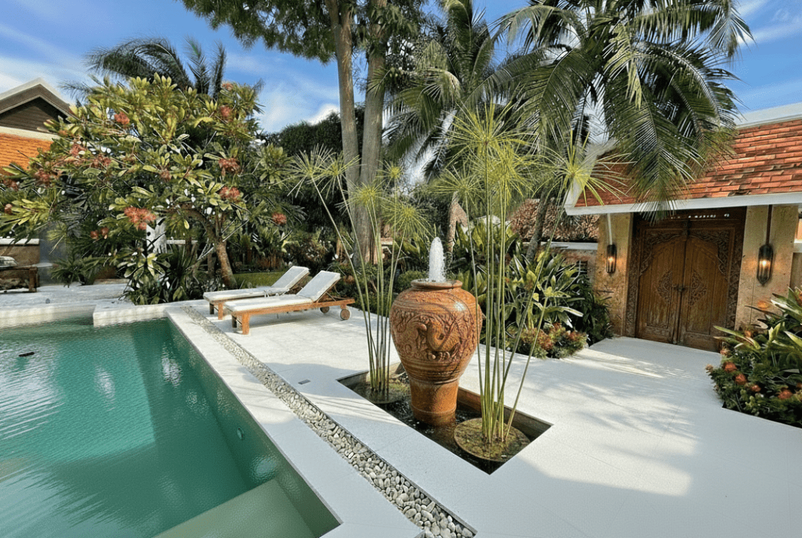 This Pool villa Stylish Boho for Sale are located in Thabali Village in Chateau Dale Thappraya Rd, Pattaya, Thailand. The property is situated on 544 sq/m of land and has a living area of 410 sq/m including 5 Bedrooms and 6 Bathrooms. This house is currently available on the market for sale at ฿ 36,000,000 The property has undergone a complete renovation. The renovation is currently entering its final phase, with completion scheduled for July 2026. The villa is being sold as partially furnished, allowing future owners to complete it according to their own preferences. And is currently under Thai Company Ownership.